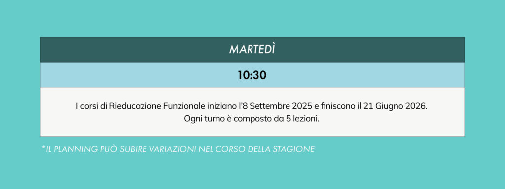 I corsi di Rieducazione Funzionale iniziano l’8 Settembre 2025e finiscono il 21 Giugno 2026. Ogni turno è composto da 5 lezioni.