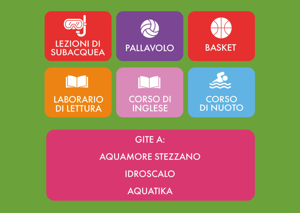 Ogni giorno è una nuova avventura: piscine, sfide di squadra, laboratori creativi e attività sempre diverse, guidate da istruttori qualificati e animatori esperti pronti a far divertire tutti in sicurezza.