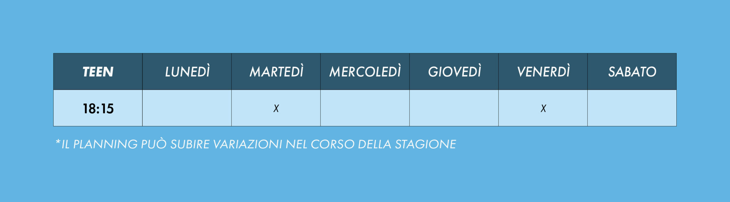 Dai 13 ai 17 anni , in una fascia d’età molto delicata, il nuoto è finalizzato all’esercizio e al benessere psico-fisico. Gli obiettivi diventano: l’apprendimento di tutti e quattro gli stili con nuotate evolute, l’introduzione di componenti agonistiche (partenza, virate)e l’introduzione di allenamenti finalizzati al miglioramento della capacità aerobica.